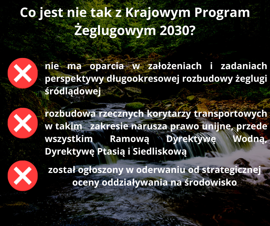 Jedną z najistotniejszych wad Krajowego Programu Żeglugowego do roku 2030 jest przygotowanie i ogłoszenie jego założeń w oderwaniu od ustaleń strategicznej oceny oddziaływania na środowisko, która powinna wskazywać ryzyka związane z realizacją poszczególnych zadań programu, ich wagę oraz ewentualne możliwości kompensacyjne oraz musi obejmować proces konsultacji społecznych. Ogłoszenie o zamówieniu publicznym, dotyczącym przygotowania dokumentacji i prognozy oddziaływania na środowisko, ukazało się 29 października 2021 r., zaś otwarcie ofert nastąpiło 10 grudnia 2021 r. Zgodnie z ogłoszeniem okres realizacji zamówienia wynosi 435 dni, zatem dokumentacja wstępna do przygotowania wymaganej przez prawo strategicznej oceny oddziaływania na środowisko zostanie udostępniona najwcześniej w pierwszym kwartale 2023 roku. Zakładając, że ocena będzie pozytywna dla zlecającego (i jak to często bywa – niekorzystna dla środowiska), Ministerstwo Infrastruktury będzie mogło realizować plany budowy dróg wodnych w Polsce najwcześniej od roku 2026.