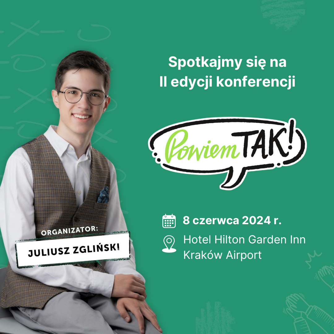 – Powiedzmy wprost, osoby z niepełnosprawnościami nadal nie mają równych szans. W wielu przypadkach odpowiadają za to niedociągnięcia systemowe lub nieświadomość na temat niepełnosprawności. Sam zmagam się z niepełnosprawnością ruchową niemal od początku swojego życia i wielokrotnie doświadczałem z tego powodu przykrości i dyskryminacji. Te negatywne doświadczenia spowodowały, że postanowiłem zabrać głos w przestrzeni publicznej i walczyć z krzywdzącymi stereotypami. Tak oto powstał pomysł zorganizowania konferencji “Powiem TAK”, której główną ideą jest przełamywanie barier i obalanie mitów dotyczących osób z niepełnosprawnościami. To już druga edycja tego wydarzenia. Jestem przekonany, że tak jak poprzednio konferencja ta będzie miejscem dialogu, wymiany doświadczeń i poszukiwaniem rozwiązań, które niosą realną zmianę – mówi Juliusz Zgliński, 17-letni licealista, organizator wydarzenia.