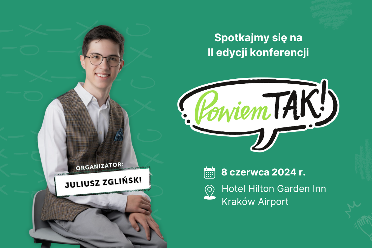 „Powiedzmy wprost, osoby z niepełnosprawnościami nadal nie mają równych szans. W wielu przypadkach odpowiadają za to niedociągnięcia systemowe lub nieświadomość na temat niepełnosprawności. Sam zmagam się z niepełnosprawnością ruchową niemal od początku swojego życia i wielokrotnie doświadczałem z tego powodu przykrości i dyskryminacji. Te negatywne doświadczenia spowodowały, że postanowiłem zabrać głos w przestrzeni publicznej i walczyć z krzywdzącymi stereotypami. Tak oto powstał pomysł zorganizowania konferencji „Powiem TAK”, której główną ideą jest przełamywanie barier i obalanie mitów dotyczących osób z niepełnosprawnościami. To już druga edycja tego wydarzenia. Jestem przekonany, że tak jak poprzednio konferencja ta będzie miejscem dialogu, wymiany doświadczeń i poszukiwaniem rozwiązań, które niosą realną zmianę” – mówi Juliusz Zgliński, 17-letni licealista, organizator wydarzenia.