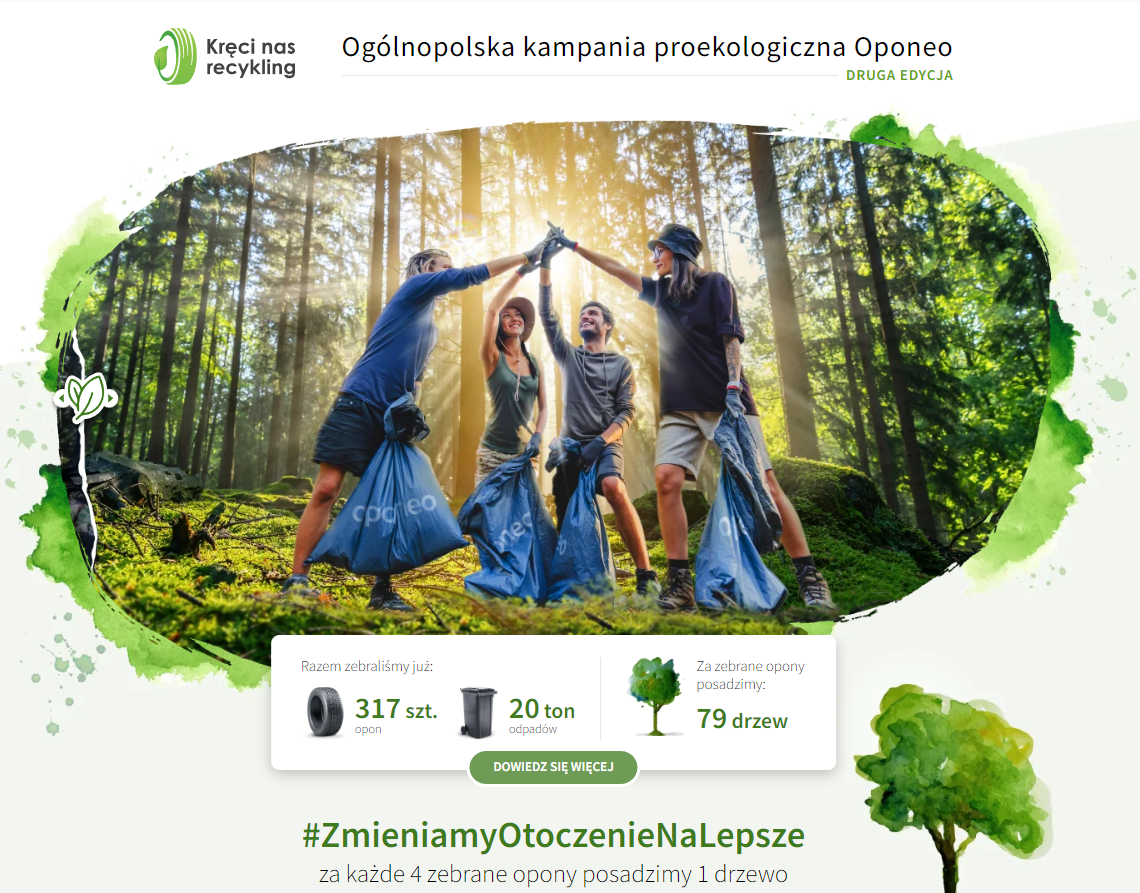 Sprzątanie terenu nie jest jedynym celem kampanii „Kręci Nas Recykling”. Podobnie jak w roku poprzednim Oponeo planuje za każde 4 zebrane zużyte opony posadzić 1 nowe drzewo w miejscu wymagającym zalesienia, co przyczyni się do odbudowy lasów w Polsce – nasz cel na ten rok to 3000 drzew. Do łącznej liczby zebranych odpadów zostanie wliczone także to ogumienie, które trafi do odpowiednich warsztatów oznaczonych logiem kampanii w trakcie wymiany opon.