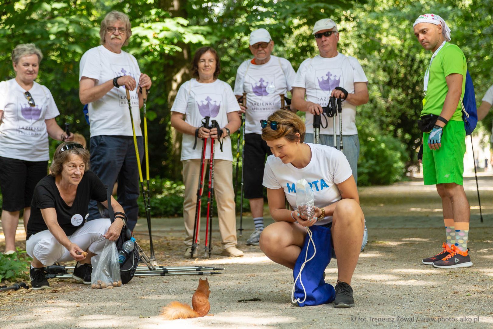 Podczas czerwcowego spaceru 14 seniorów wyposażonych w kijki do Nordic walking (oraz pod czujnym okiem instruktora) pokonało blisko 2,5 km trasę po Łazienkach Królewskich. Na trasie spaceru znalazły się m.in. Podchorążówka, Nowa Pomarańczarnia, świątynia Sybilli czy amfiteatr. W czasie przemarszu udało się spotkać nie tylko charakterystyczne dla Łazienek Królewskich wiewiórki czy pawie, lecz także sarnę – jedyną mieszkającą w Łazienkach królewskich przedstawicielkę tego gatunku, która od prawie 10 lat spaceruje po parkowych alejkach.