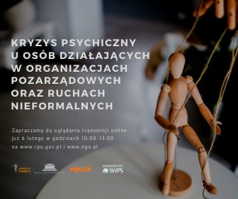 W czwartek 6 lutego w Biurze Rzecznika Praw Obywatelskich odbędzie się konferencja poświęcona kryzysom psychicznym u osób działających w organizacjach pozarządowych oraz ruchach nieformalnych. Zapraszamy do oglądania transmisji z wydarzenia.
