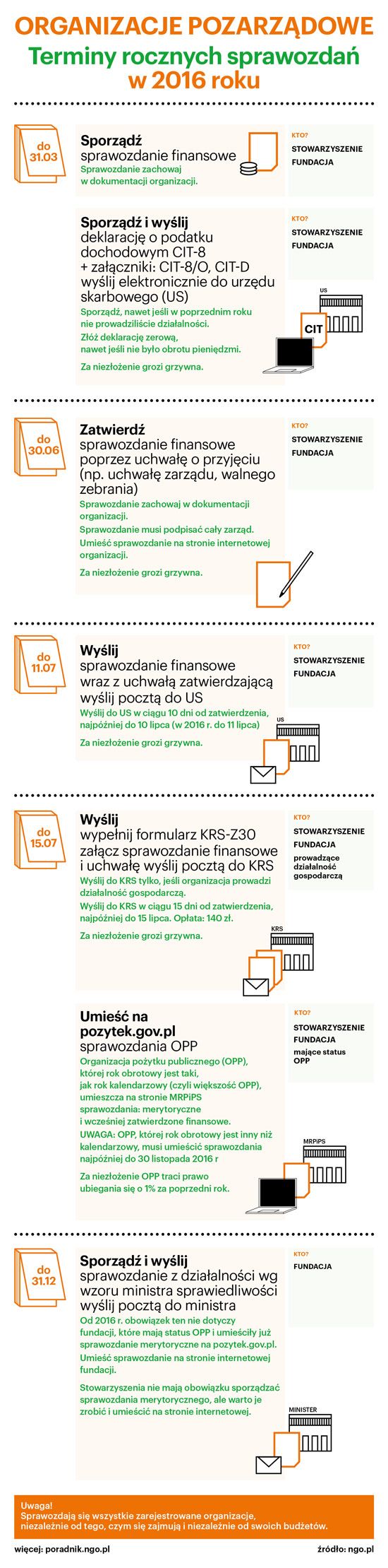 Wszystkie organizacje pozarządowe muszą wysyłać co roku swoje sprawozdanie finansowe za poprzedni rok (np. w 2016 r. za 2015 r.) oraz deklarację CIT-8 do urzędu skarbowego. Powinny to zrobić niezależnie od tego, czym się zajmują i jak duże mają roczne budżety. Jeśli prowadzą działalność gospodarczą lub mają status organizacji pożytku publicznego, mają więcej obowiązków sprawozdawczych.