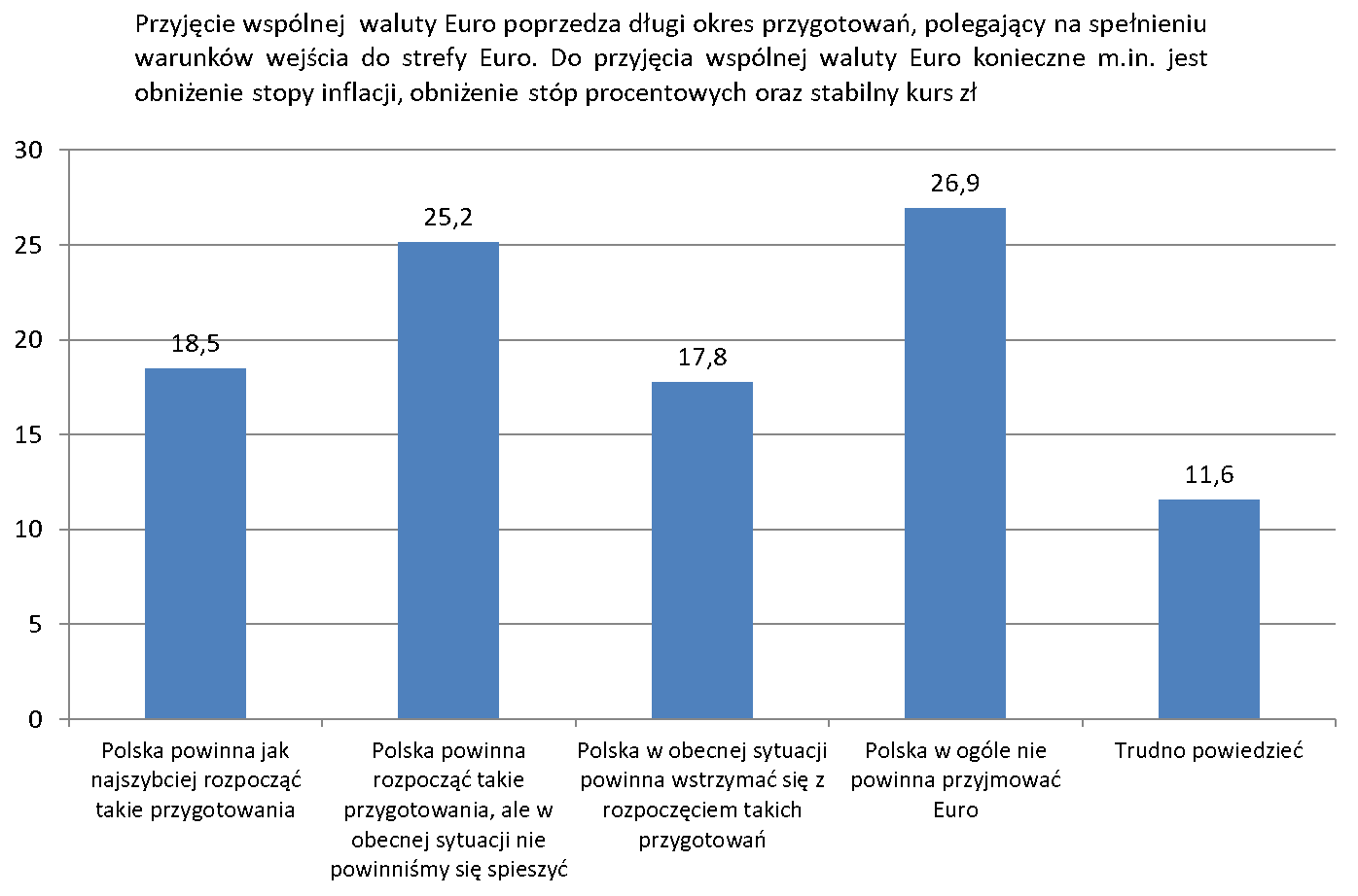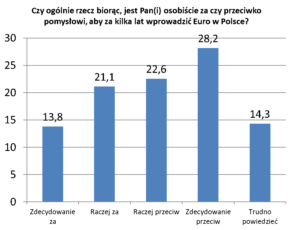 Jednak wbrew głosom płynącym z obozu rządzącego, blisko połowa badanych (43,7%) opowiada się za rozpoczęciem przygotowań do wejścia Polski do strefy euro. Wśród nich 18,5% badanych opowiada się, za jak najszybszym rozpoczęciem tego procesu. Opcję, że Polska powinna rozpocząć takie przygotowania, ale w obecnej sytuacji nie powinniśmy się spieszyć, wybiera 25,2% badanych. Jedynie 26,9% badanych uważa, że Polska w ogóle nie powinna przyjmować euro.