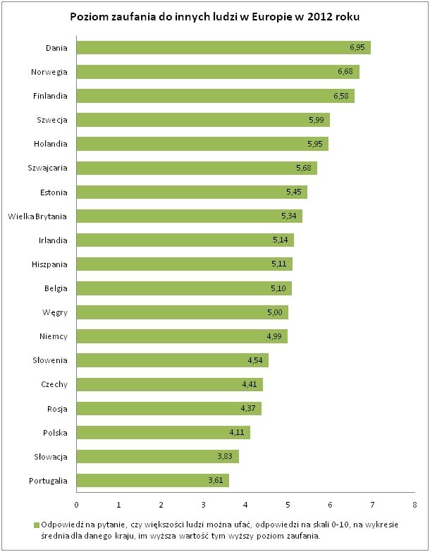 Polska należy do krajów o najniższym poziomie zaufania między ludźmi (4,11, średnia odpowiedzi na pytanie, czy większości ludzi można ufać). W rankingu wyprzedzamy tylko Słowację (3,83) i Portugalię (3,61). Najwyższymi wskaźniki zaufania cieszą się Skandynawowie (ok. 6 i powyżej) i – co ciekawe – bardzo wysoki poziom zaufania cechuje również Estonię (5,45).