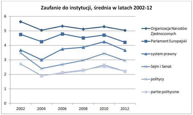 Największym zaufaniem obdarzamy instytucje międzynarodowe – Parlament Europejski (4,22) i Organizację Narodów Zjednoczonych (5,04). Mniejsze zaufanie deklarujemy do krajowych instytucji politycznych: systemu prawnego (3,6), Sejmu i Senatu (2,95), polityków (2,22) oraz partii politycznych (2,22).
