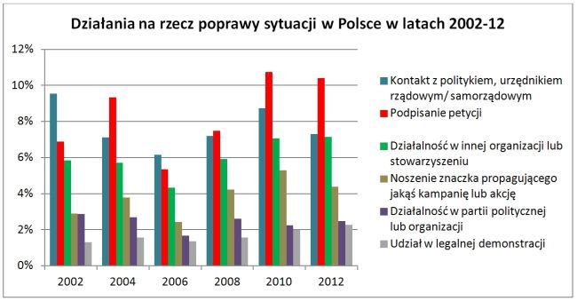Wyniki ESS wzmacniają w istocie tezę o „chałupniczej” naturze społeczeństwa obywatelskiego, ponieważ dostarczają licznych dowodów na niewielką aktywności Polaków w sferze publicznej. Niewiele osób angażuje się w różnego rodzaju działania, by poprawić sytuację w kraju lub zapobiec pogarszaniu się jej. Najczęstszym zachowaniem było w 2012 roku podpisywanie petycji (10,4%), kontakt z politykiem lub urzędnikiem (7,3%) oraz działalność w organizacji innej (niż polityczna) lub stowarzyszeniu (7,1%). W ciągu jednej dekady między rokiem 2002 a 2012 ESS zarejestrował wzrost (z poziomu 5,9%) odsetka osób angażujących się w działalność organizacji (w 2002).