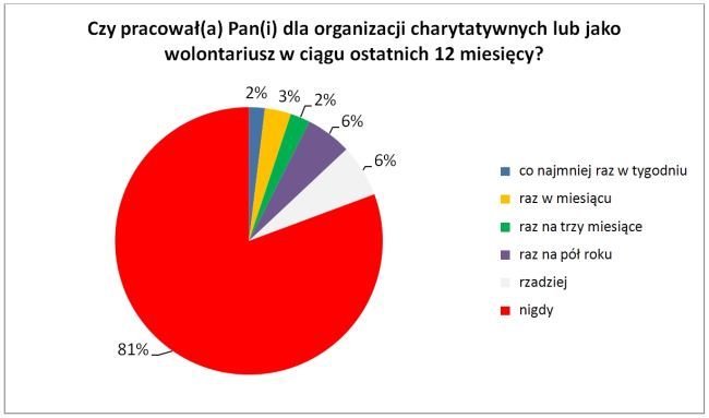 Dodatkowo w szóstej edycji ESS pojawiło się pytanie o pracę na rzecz organizacji charytatywnych lub działalność wolontariacką dla tych organizacji. 81% osób nie podejmowało takiej aktywności w ciągu ostatniego roku. Przynajmniej raz na kwartał w funkcjonowanie organizacji charytatywnych włącza się 7% badanych.