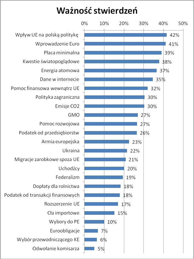 Zdecydowanie najrzadziej osoby, które wypełniły test Latarnika, interesują tematy związane z funkcjonowaniem Parlamentu Europejskiego np. wyborem przewodniczącego Komisji Europejskiej. Równie niewielki odsetek użytkowników interesuje się kwestiami takimi, jak euro obligacje, czy cła importowe.