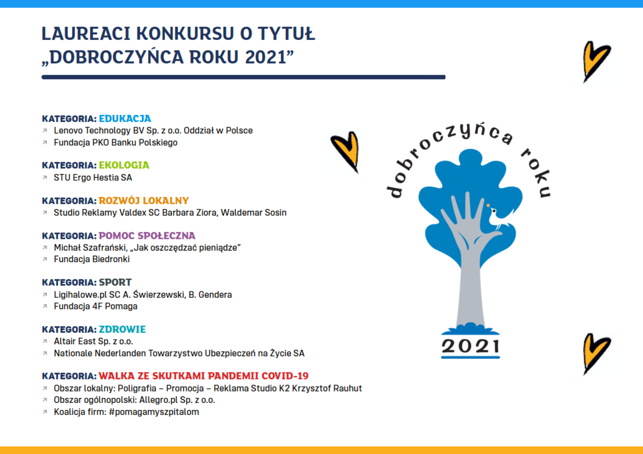 Aż 10 firm i fundacji korporacyjnych otrzymało w tym roku tytuł „Dobroczyńca Roku” m.in. za działania na rzecz zdrowia, ekologii, edukacji i pomoc społeczną we współpracy z organizacjami pozarządowymi. Nagrody za działania przeciw skutkom pandemii, w kategorii specjalnej, otrzymały Allegro.pl, Studio K2 Krzysztof Rauhut oraz koalicja firm #POMAGAMYSZPITALOM. Statuetki wręczono 27 maja w Teatrze Capitol w Warszawie.