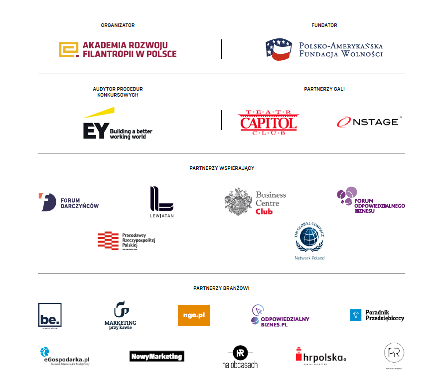 Organizatorem Konkursu o tytuł „Dobroczyńca Roku” jest Akademia Rozwoju Filantropii w Polsce. Fundatorem Konkursu jest Polsko-Amerykańska Fundacja Wolności. Nad prawidłowością przebiegu procedur Konkursu czuwa firma EY. Partnerami dwudziestej czwartej edycji Konkursu są Polska Konfederacja Pracodawców Prywatnych „Lewiatan”, Business Centre Club, Global Compact Network Poland, Pracodawcy RP, Forum Odpowiedzialnego Biznesu, Forum Darczyńców. Partnerzy branżowi: portal organizacji pozarządowych ngo.pl, CR Navigator, Marketing przy kawie, odpowiedzialnybiznes.pl, poradnikprzedsiebiorcy.pl, egospodarka.pl, Nowy Marketing, HR na obcasach, HR Polska, publicrelations.pl. Więcej na www.dobroczyncaroku.pl.