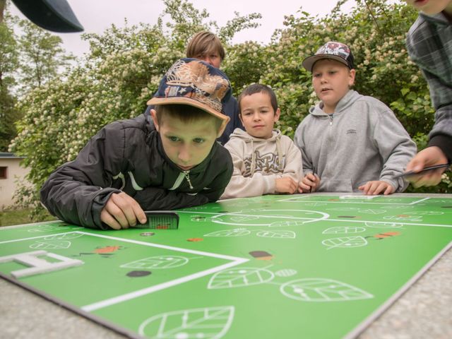 Unowocześniono również grę w klasy. Tym razem wykorzystano głośnik i czujnik ruchu. Działał, jak nietoperz – wysyłał ultradźwięk, który odbijał się i wracał do odbiornika. Na tej podstawie urządzenie liczyło, w jakiej odległości znajduje się najbliższy obiekt. Zadaniem dzieciaków, było – skacząc na jednej nodze – wychwycić kilka punktów w przestrzeni. Kiedy naskoczyły na właściwe miejsce, z głośnika wybrzmiewało pytanie. Na przykład takie: Ile słoni mieszka w oceanie? Nie chodziło o to, by udzielić jedynej słusznej odpowiedzi, ale by uruchomić wyobraźnię. Grę wygrywał ten, komu udało się znaleźć trzy punkty i odpowiedzieć na każde z pytań.