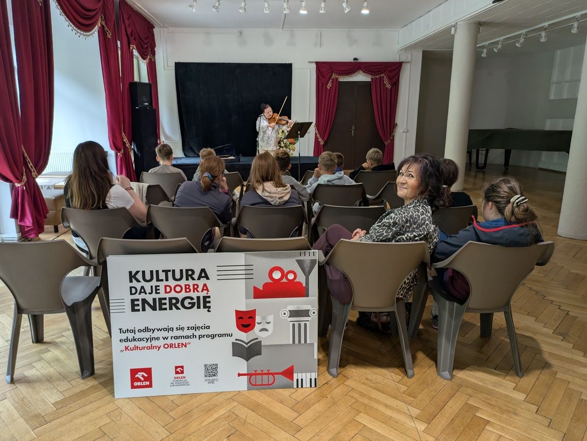 Po okresie promocji projektu i rekrutacji szkół do udziału w zadaniu, 11września 2025 roku rozpoczęliśmy piękną przygodę w świecie sztuki. Na początek zabrzmiały dźwięki altówki podczas warsztatów muzycznych w słupskiej Filharmonii Sinfonia Baltica. Zajęcia prowadziła p. Aniela Hyla, która zagrała na altówce. Uczniowie wysłuchali utworów zarówno z obszaru muzyki klasycznej, jak też współczesnych aranżacji muzycznych. Była to wspaniała okazja, by poczuć atmosferę pracy w filharmonii, poznać rodzaje instrumentów tworzących orkiestrę, a nawet… wejść na scenę.