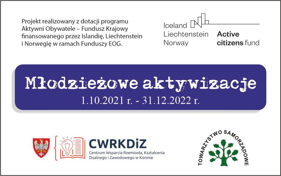 „Młodzieżowe aktywizacje” to nazwa projektu realizowanego przez Towarzystwo Samorządowe z Konina z dotacji programu Aktywni Obywatele – Fundusz Krajowy finansowanego przez Islandię, Liechtenstein i Norwegię w ramach Funduszy EOG.