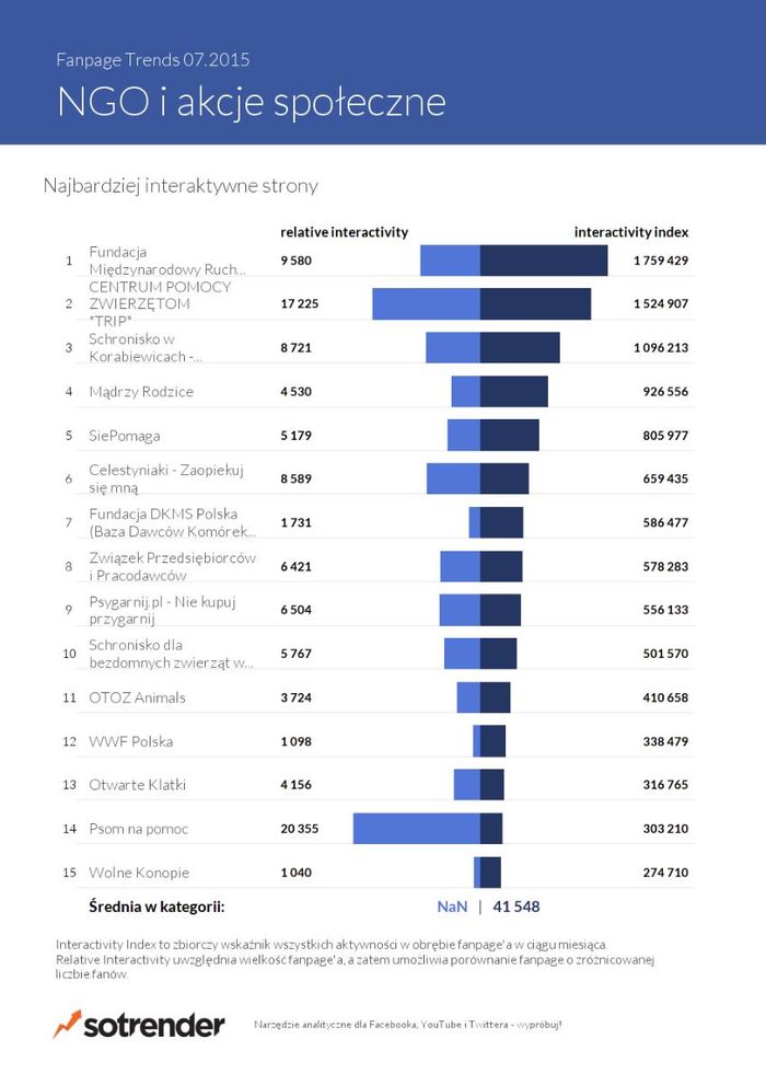 Jeśli chodzi o angażowanie społeczności skupionych wokół fanpage’a, największe wyniki wygenerowały Mądrzy Rodzice, Fundacja Międzynarodowy Ruch Na Rzecz Zwierząt Viva! oraz Centrum Pomocy Zwierzętom „Trip”. Wszystkie trzy podmioty mają na swoich kontach również najbardziej angażujące wpisy - w przypadku Mądrych Rodziców był to „coniedzielny Dzień Ojca”, CPZ „Trip” przypomniało, aby na wakacje zabrać również domowego pupila, a Fundacja MRNRZ Viva! zamieściła informację nt. oficjalnego stanowiska Policji dotyczącego możliwości wybicia szyby w samochodzie, jeśli wewnątrz zamknięty jest zwierzak.