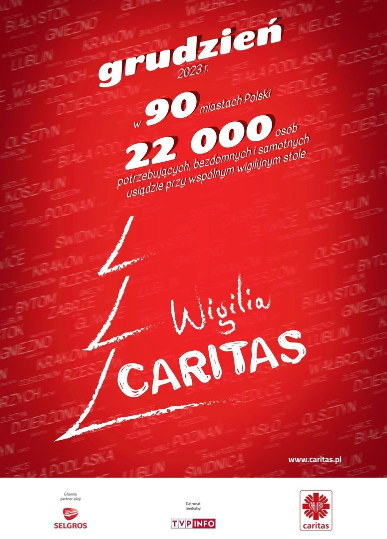W całej Polsce przy wigilijnym stole Caritas w 90 miastach zasiądzie 22 tysięcy osób potrzebujących wsparcia, bezdomnych i samotnych. Do przygotowania posiłków zużyjemy łącznie: 3 tony kapusty kiszonej, 6,5 tony karpia, 7,5 tys. litrów barszczu czerwonego i 16,7 km obrusów. W organizację wigilii zaangażuje się ponad 2 tysiące pracowników i wolontariuszy Caritas w Polsce.