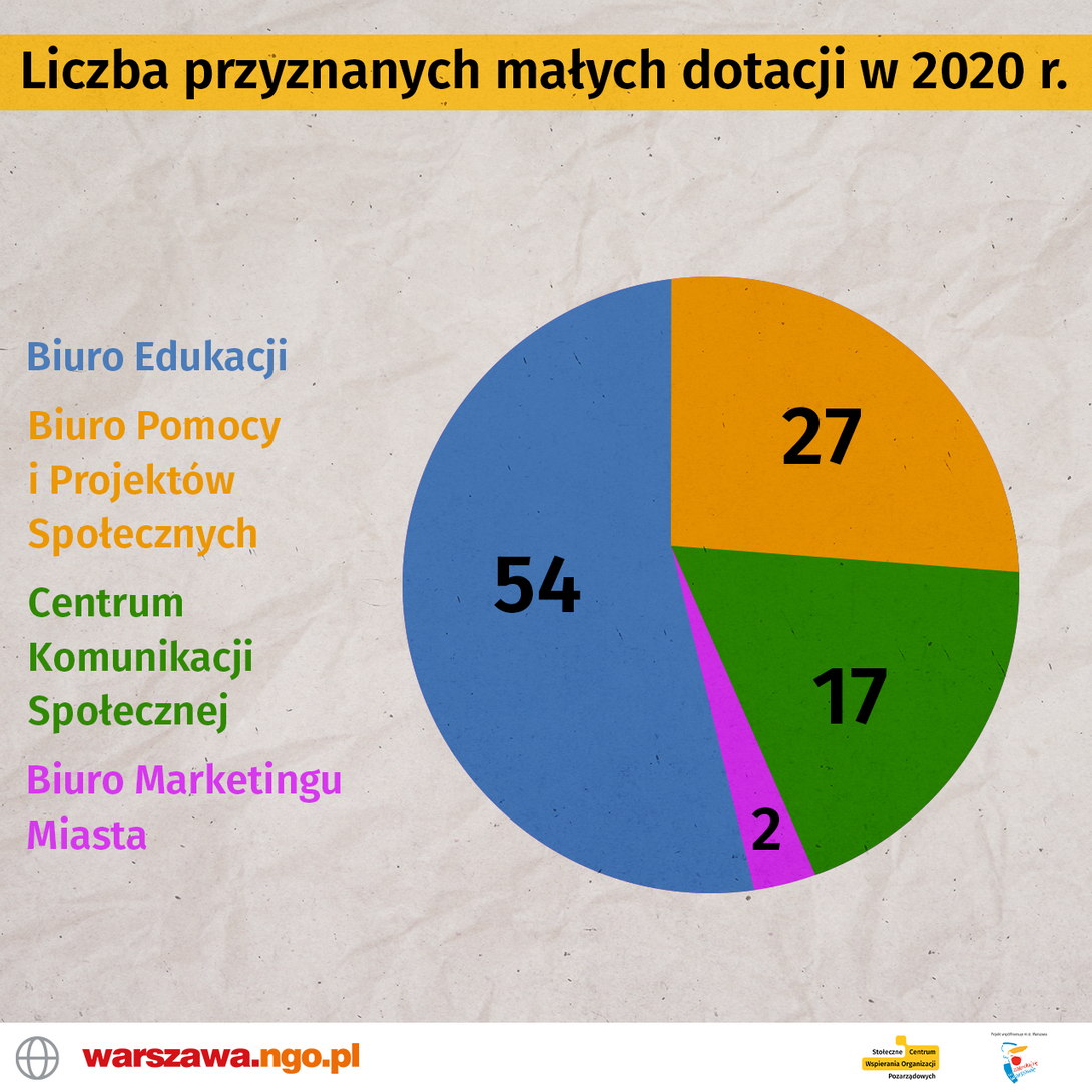 W 2020 r. organizacje wnioskowały o ponad 6 545 tys. zł na działania w ramach małych dotacji. Z tego m.st. Warszawa przekazało na ich realizację ponad 2 187 tys. zł.