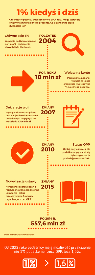 Od 2004 roku organizacje dobroczynne co rok mają szansę zyskać wpływy z tzw. jednego procenta podatku: to już blisko dwie dekady! Sprawdźmy, co — oprócz kwoty, która w tej chwili wynosi już 1,5% — zmieniało się w tym popularnym rządowym programie.