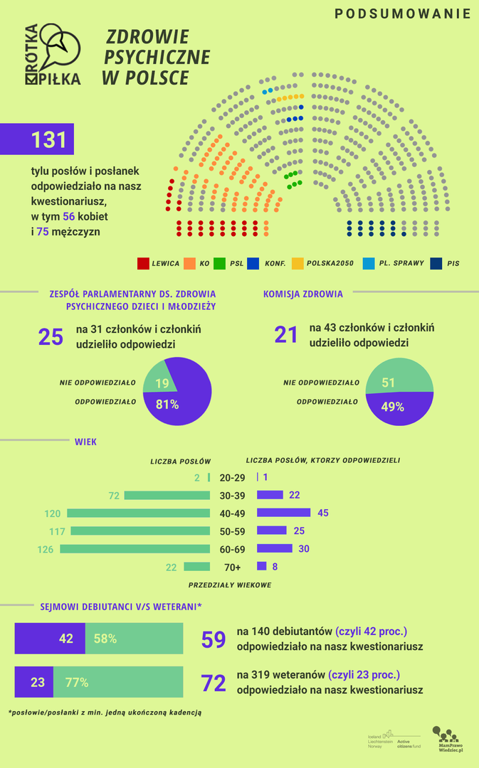 Na pytania MamPrawoWiedziec.pl dotyczące zdrowia psychicznego w Polsce odpowiedziało 131 posłów i posłanek. W podziale na kluby i koła odpowiedzi udzieliło: