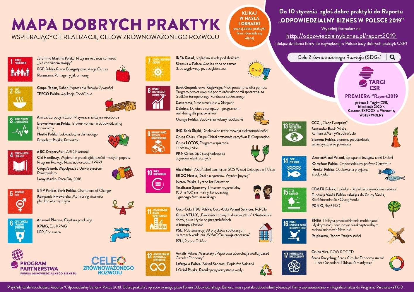 Przykłady działań biznesu opisane w podziale na 17 globalnych wyzwań ONZ zawiera „Mapa dobrych praktyk wspierających realizację Celów Zrównoważonego Rozwoju”. Infografika, przygotowana przez Forum Odpowiedzialnego Biznesu, odnosi się do aktywności firm na polu odpowiedzialności społecznej i środowiskowej. Ma inspirować do zgłaszania prowadzonych inicjatyw CSR do 10 stycznia do corocznego Raportu “Odpowiedzialny biznes w Polsce. Dobre praktyki”.