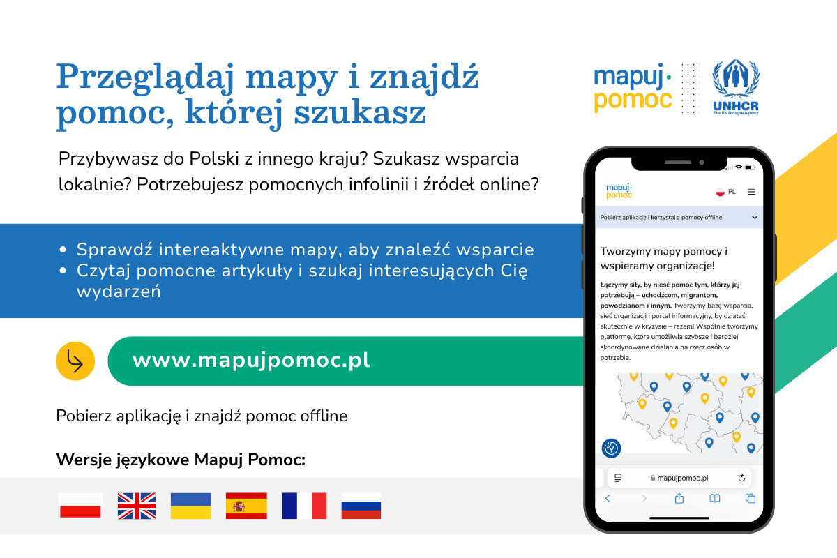 Aby informacja o nowościach w portalu dotarła do jak najszerszej grupy odbiorców, a mapy stały się skutecznymi narzędziami wsparcia zespół Mapuj Pomoc rozpoczął ogólnopolską kampanię informacyjną. Do ponad 300 punktów pomocowych w całej Polsce rozesłano plakaty promocyjne w język angielskim. Można je również pobrać, wraz z grafikami do wykorzystania w mediach społecznościowych, pod adresem: https://mapujpomoc.pl/kampania-informacyjna-2025/