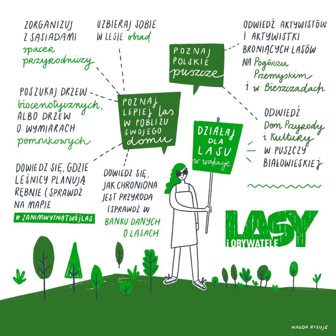 Bardzo zachęcam, by podczas wakacji eksplorować szczególnie te lasy blisko nas – taka turystyka nie wymaga szczególnych nakładów finansowych ani czasowych. Jeżeli lubimy eksperymenty i mamy wiedzę o roślinach jadalnych, podczas spaceru możemy uzbierać sobie obiad. Wycieczkę po lesie można też zorganizować razem z sąsiadami i zaprosić ornitologa albo przyrodniczkę, którzy pomogą nam lepiej odczuć i zrozumieć las. Jeśli ktoś ma więcej czasu, może wykorzystać stworzone przez nas narzędzia do monitorowania lasu i gospodarki leśnej. Warto sprawdzić na naszej mapie rębni #ZanimWytnąTwójLas, czy leśnicy nie planują w naszej okolicy intensywnych wycinek – może uda się na czas im zapobiec. Udostępniamy też materiały, które pomogą odnaleźć tak zwane drzewa biocenotyczne albo drzewa o rozmiarach pomnikowych.