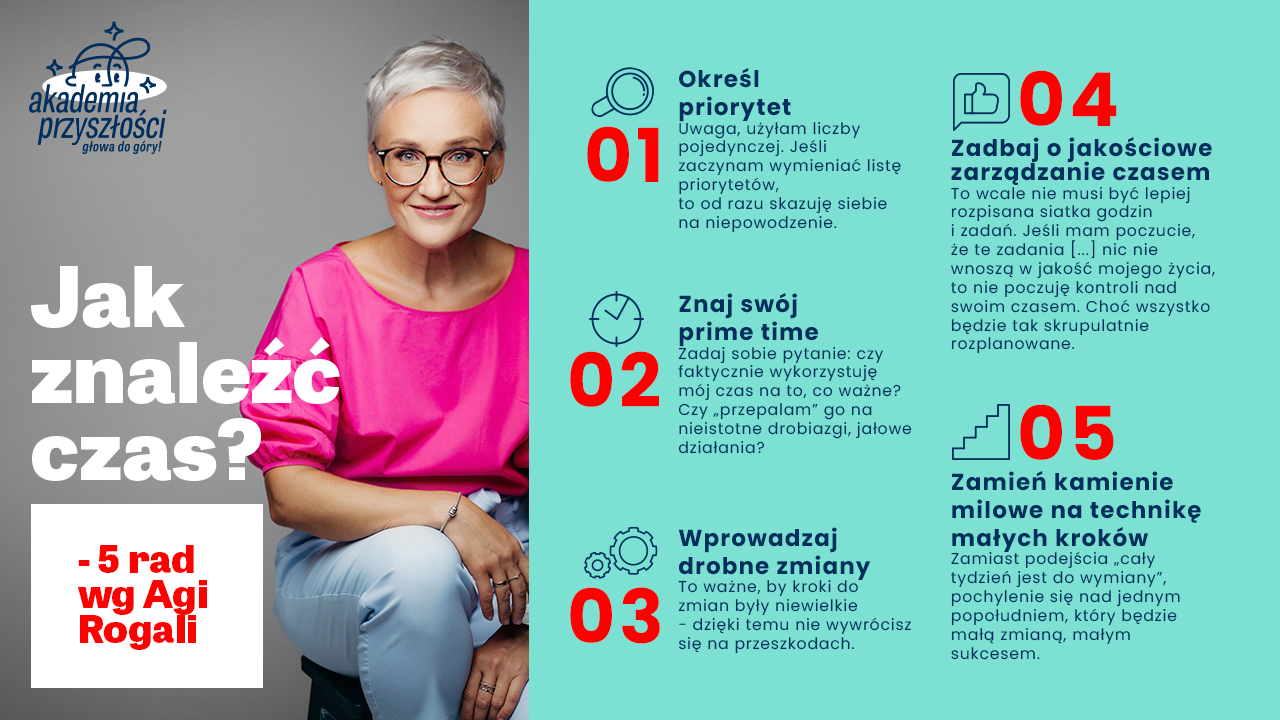 – Aby wziąć sprawy związane z czasem w swoje ręce, potrzebuję zatrzymać się i zauważyć, na co ten czas „wydaję”. To nieprawda, że wypełniają go same ważne, niezbędne czynności. Warto odpowiedzieć sobie na kilka pytań. „Co jest moim priorytetem?” (…) „Co jest dla mnie teraz najważniejsze?” – radzi Aga Rogala. – To ważne, by kroki do zmian były niewielkie, dzięki temu nie wywrócę się na przeszkodach. Zamiast totalnego remanentu w życiu – jakaś drobna rzecz zrobiona inaczej. Zamiast podejścia „cały tydzień jest do wymiany”, pochylenie się nad jednym popołudniem, który będzie moją zmianą. Który będzie moim sukcesem.