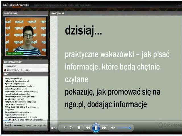 Podczas pierwszej części uczestnicy webinarium mogli dowiedzieć się, jak tworzyć ciekawe i przykuwające uwagę informacje o tym, co robi organizacja. W drugiej części - o tym, jak dodawać informacje do ngo.pl i wykorzystać portal jako narzędzie promocji. Webinarium prowadziła Dorota Kostowska, specjalistka od webinariów.