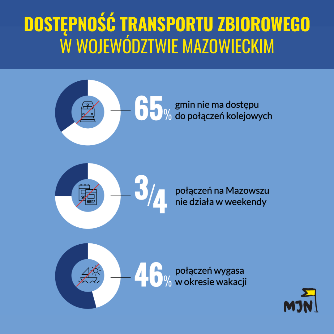 Ogromne nierówności widać na przygotowanych przez MJN mapach, dostępnych również w internecie, na których liczbę połączeń zestawiono z liczbą mieszkańców każdej mazowieckiej gminy. Widać je też w liczbach, które przytaczają aktywiści w raporcie: 65% gmin w województwie nie ma dostępu do połączeń kolejowych, i to mimo, że przez wiele z nich przechodzą tory – nie są jednak wykorzystywane w ruchu pasażerskim. Co więcej, ¾ wszystkich połączeń transportem publicznym na Mazowszu nie działa w weekendy, a 45% całkowicie wygasa w okresie wakacji letnich.