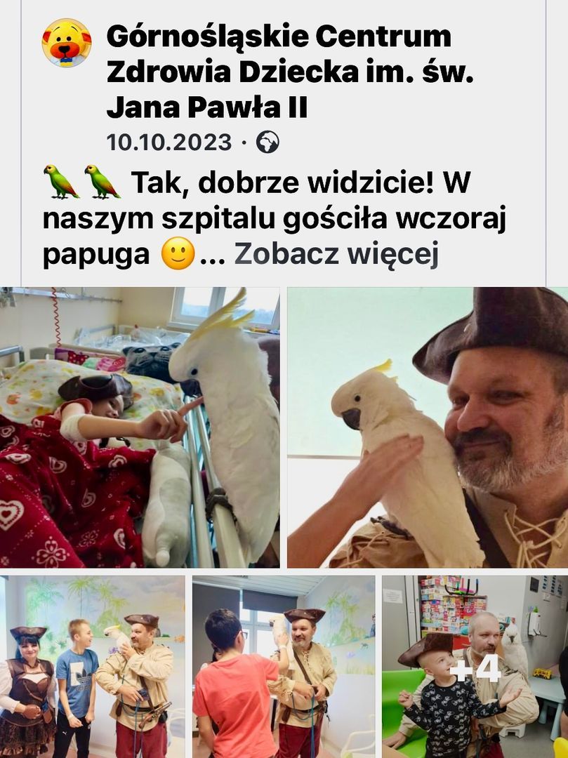 2-letnia Megusia kakadu triton 10 października odwiedziła wraz ze swoimi opiekunami piratami chore dzieci na oddziałach neurologii oraz rehabilitacji neurologicznej Górnośląskiego Centrum Zdrowia Dziecka w Katowicach.