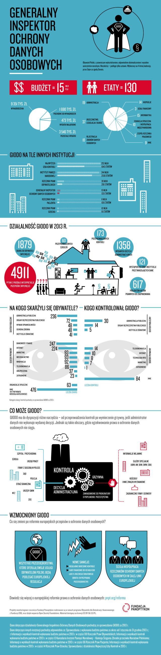 Fundacja Panoptykon opublikowała infografikę, wyjaśniającą na czym polega rola i znaczenie Generalnego Inspektora Danych Osobowych oraz w jaki sposób jego kompetencje zostaną wzmocnione w wyniku zmiany europejskiego prawa. Świadomość tego, że GIODO to kluczowy organ dla ochrony praw i wolności obywatelskich w coraz bardziej cyfrowym świecie, najwyraźniej nie dotarła jeszcze do polityków. Od rezygnacji Wojciecha Wiewiórowskiego na początku grudnia urząd GIODO pozostaje nieobsadzony. W mediach pojawiły się informacje, że Klub Parlamentarny Platformy Obywatelskiej wycofał poparcie dla Mirosława Wróblewskiego – jedynego kandydata ubiegającego się o to stanowisko.
