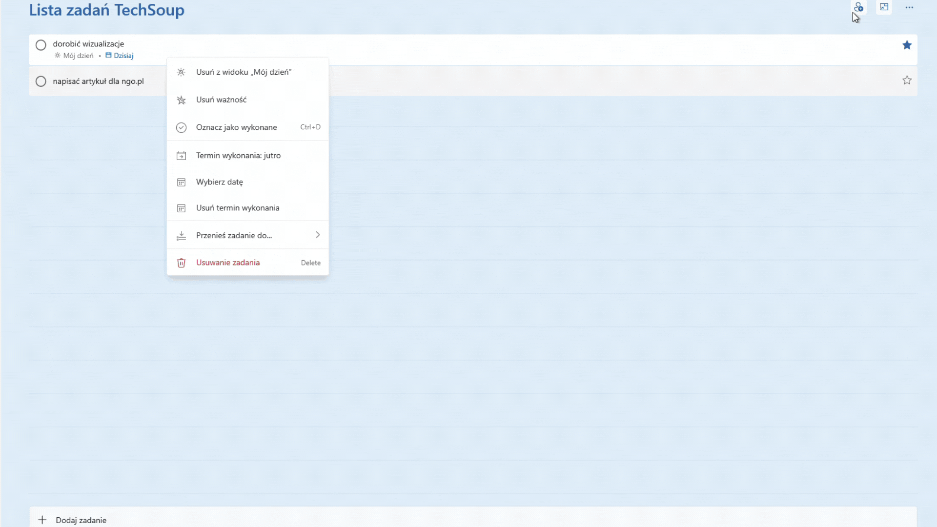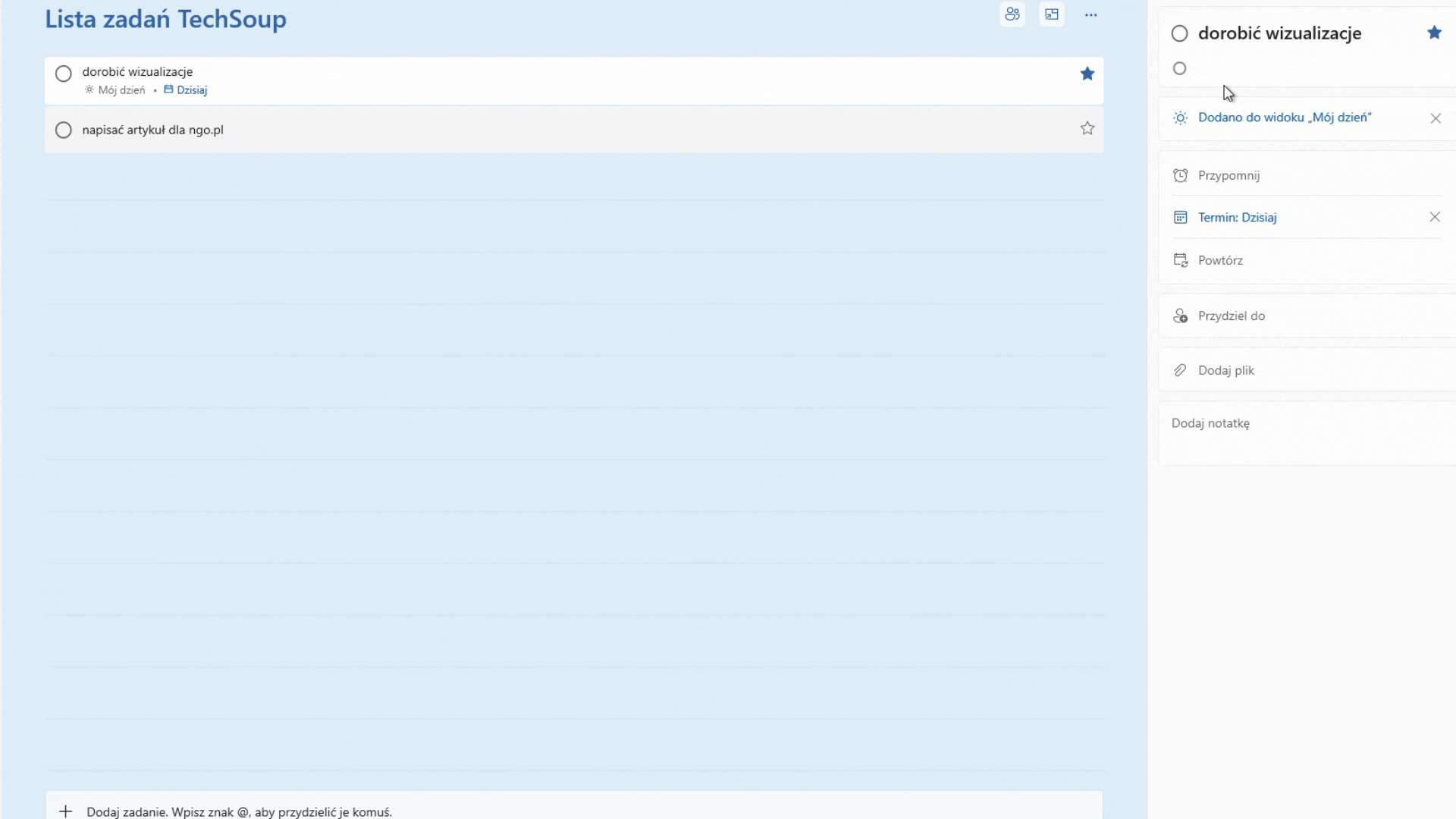 - Kliknij pole „Dodaj zadanie”, wpisz, co musisz zrobić, np. „Przygotować wniosek o grant” i naciśnij Enter.