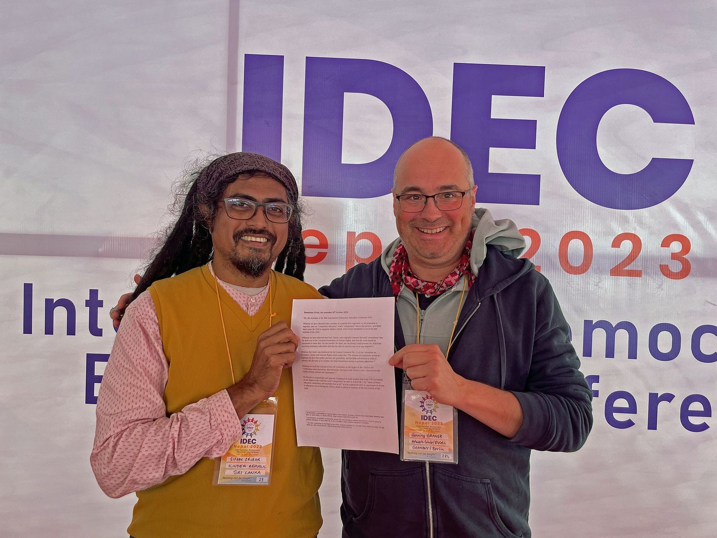 Rezolucja została opracowana wspólnie przez zwolenników edukacji demokratycznej pod przewodnictwem Richarda Franshama (Kanada), Sifaana Zavahira (Sri Lanka), Henninga Granera (Niemcy) i Je'anny Clements (RPA), przy udziale uczestników z wielu innych krajów. Została przyjęta na Walnym Zgromadzeniu IDEC w czwartek 19 października 2023 r. i przesłana do Komitetu Praw Dziecka ONZ – aby upamiętnić rocznicę uchwalenia Konwencji Narodów Zjednoczonych o Prawach
