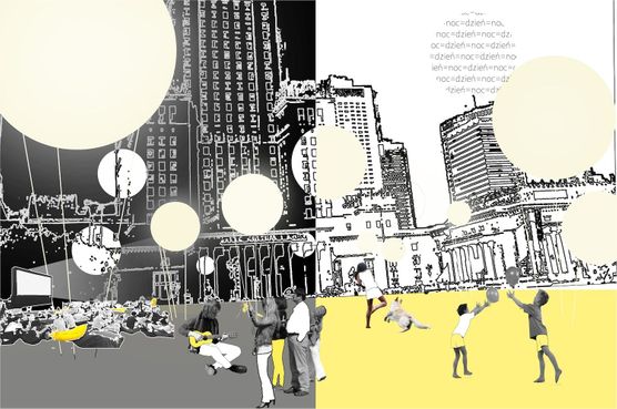 Wartością jest także zaproponowanie sposobu funkcjonowania placu w nocy. Dzięki świecącym balonom-słońcom zyskuje on umowny strop i staje się zarysowany także „z góry”. Kolor żółty, który zajmuje całą powierzchnię placu, nie musi być traktowany dosłownie – chodzi o wprowadzenie nastroju i symboliczne dookreślenie miejsca jednym gestem.