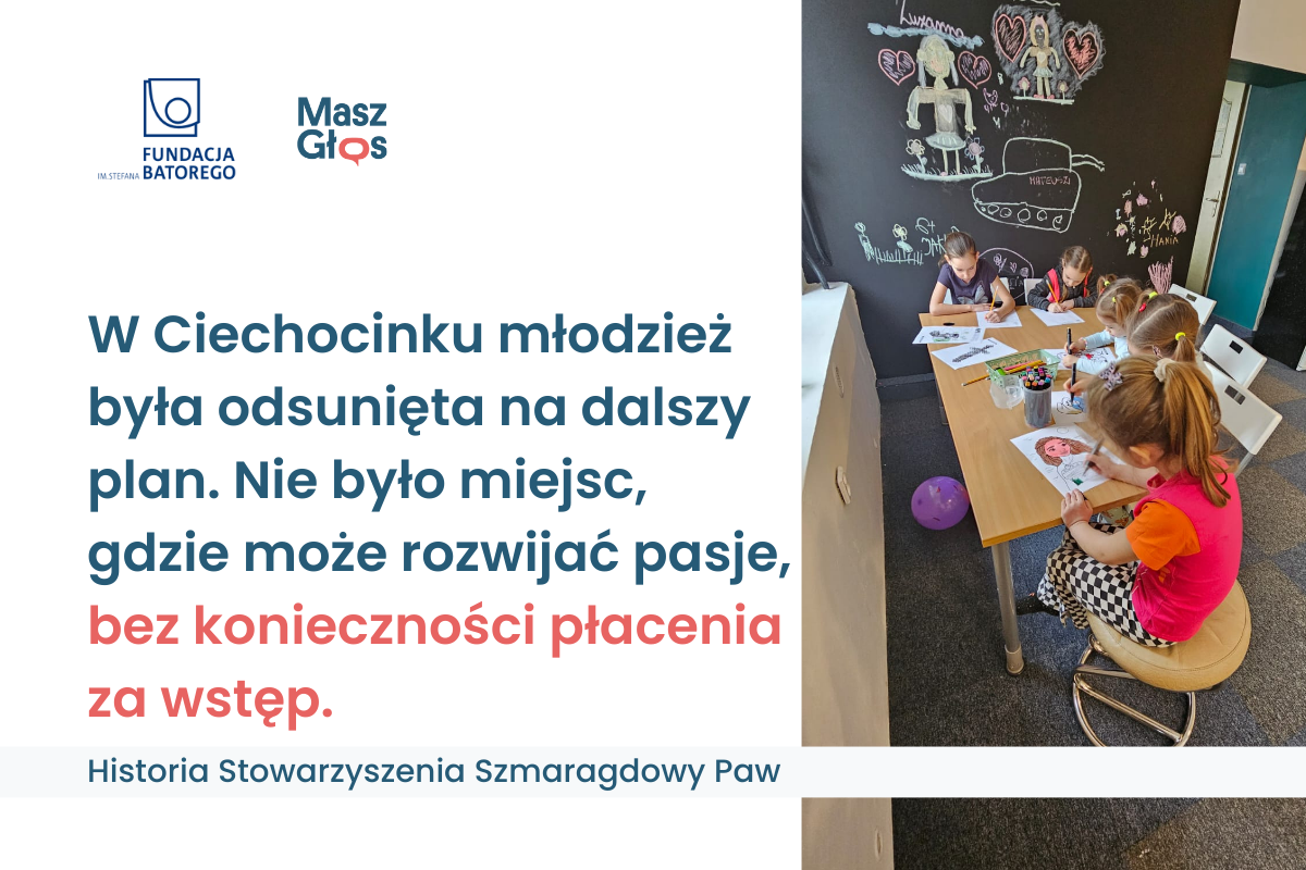 „W Ciechocinku młodzież była odsunięta na dalszy plan. Miasto nie miało spójnej polityki nastawionej na rozwiązywanie jej problemów, nie oferowało miejsc, gdzie młodzi ludzie mogliby spędzać wolny czas bez konieczności płacenia za wstęp i rozwijać swoje zainteresowania” – zwraca uwagę Iwona Janicka, w tamtym czasie koordynatorka akcji Masz Głos Fundacji Batorego. Stowarzyszenie Szmaragdowy Paw dostrzegło ten problem i postanowiło działać.