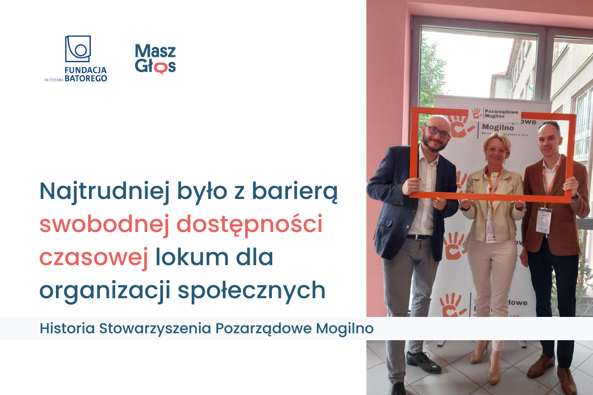 Członkowie Stowarzyszenia Pozarządowe Mogilno reprezentują różne organizacje lokalne. Kilka lat temu zdecydowali się działać pod wspólnym szyldem, żeby mieć mocniejszą siłę przebicia w powiecie. Na organizacje tego rodzaju mówi się „parasolowe”; są powoływane do celów rzeczniczych. Pierwszą ze spraw było stworzenie miejsca na działania społeczne, którego podjęli się w ramach akcji Masz Głos Fundacji Batorego.