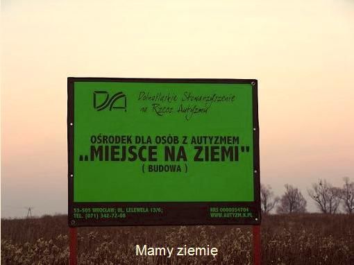 Stowarzyszeniu udało się zakupić kilka hektarów ziemi w Czernicy pod Wrocławiem, w ramach projektu „Miejsce na Ziemi”. Ma tam powstać pierwszy w Polsce ośrodek dla dorosłych autystyków, tworzony na wzór rozwiązań z krajów Unii Europejskiej, czyli małych specjalistycznych domów z różnymi formami terapii, rehabilitacji i aktywności zawodowej. Z pomocy ośrodka będą mogły skorzystać osoby autystyczne z Wrocławia i Dolnego Śląska oraz ich rodziny.