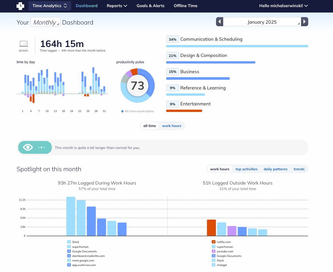 Drugi sposób na monitorowanie czasu pracy to odpalenie w tle specjalnej aplikacji. Ja używam RescueTime. Narzędzie zbiera dane dotyczące czasu spędzonego w poszczególnych aplikacjach i na stronach internetowych, a następnie je kategoryzuje. Wyznacza tzw. Productive Pulse, bazując na tym, ile czasu spędziliśmy w konkretnych aplikacjach i na stronach.