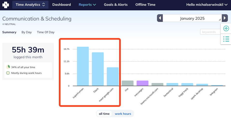 Ewidencja czasu pracy motywuje do optymalizacji. Skoro przez ostatnie lata siedzę tak dużo w e-mailach, Slacku i Google Meet, to znaczy, że powinienem lepiej nauczyć się korzystać z tych narzędzi i wypracować sobie jeszcze lepsze praktyki komunikacji w sieci. Być może w takim kontekście uzasadnione są i wydatki na aplikacje, które mogą mi w tym pomóc.
