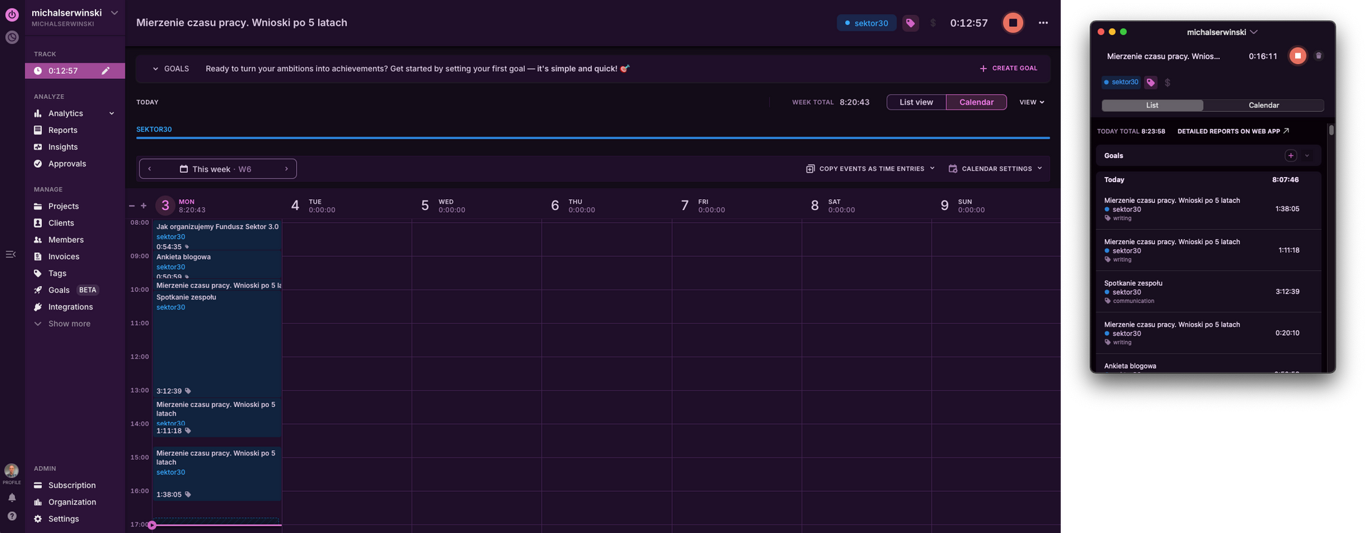 Do zapisywania i raportowania czasu pracy używam aplikacji Toggl Timer. Doceniam ją za prostotę, niezawodność i przejrzysty interfejs. Podczas rozpoczynania pracy nad danym zadaniem należy w czasie rzeczywistym opisać zadanie (projekt np. Sektor 3.0, tag np. edycja, administracja) i wcisnąć PLAY, a podczas zakończenia pracy zatrzymać zmierzony czas. W aplikacji warto wcześniej przygotować sobie listę projektów i tagów, z których będzie się na bieżąco korzystać.