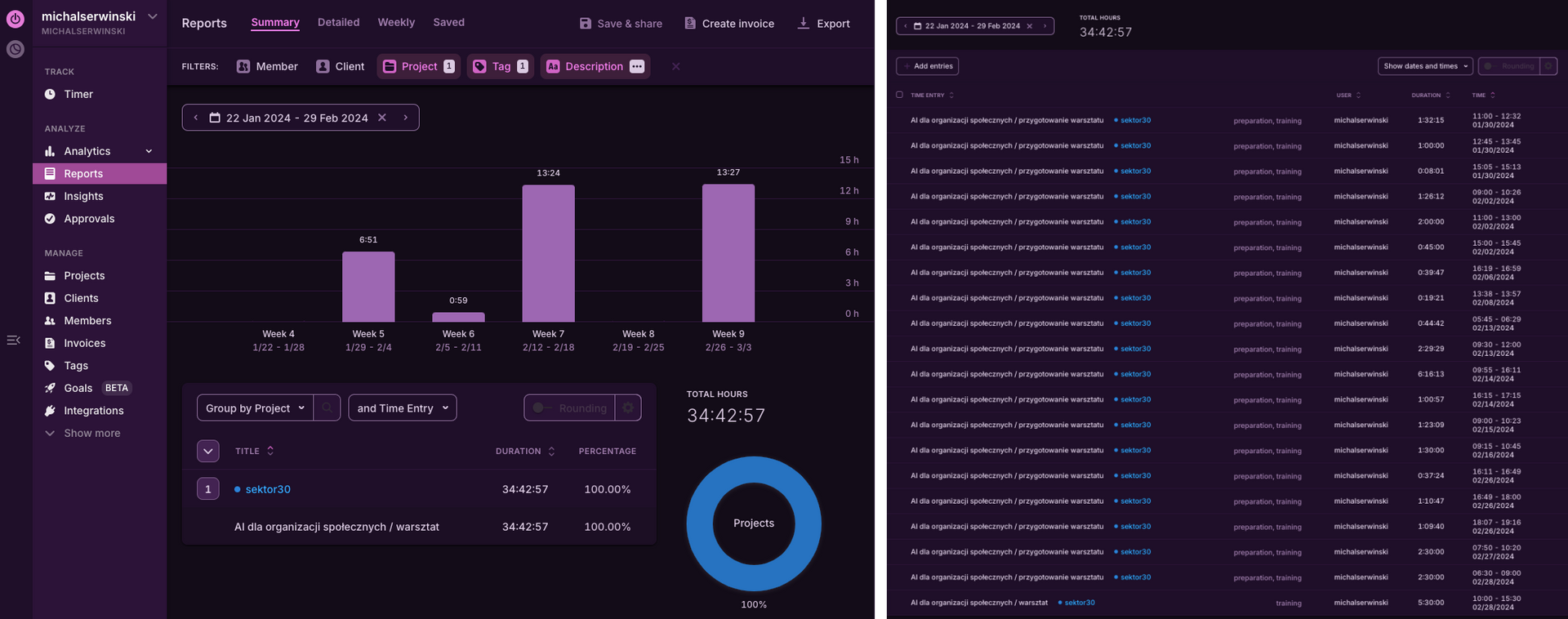 W zapale pracy często zapominamy o upływie czasu. Kiedy zależy nam na rezultatach, a konkretnie na ich jakości, upływające minuty przestają się liczyć. Przekonałem się o tym na początku ubiegłego roku podczas pracy nad cyklem nowych szkoleń o sztucznej inteligencji dla organizacji społecznych razem z lubianą przez Was autorką i koordynatorką naszych kursów e-learningowych Moniką Schmeichel-Zarzeczną. Według aplikacji Toggl przeznaczyłem na przygotowanie się 29 godzin. Samo szkolenie trwało pięć. Wpisy dodatkowo oznaczałem tagami, które oznaczały przygotowanie do szkolenia i samo jego przeprowadzenie. Filtrowanie w łatwy sposób umożliwia wyciągnięcie danych.