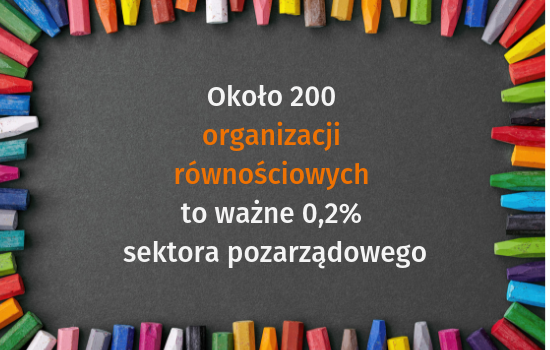 Szacujemy, że w Polsce działa około 200 organizacji równościowych, czyli takich, które w ramach głównego obszaru swojej działalności zajmują się ochroną praw i wolności człowieka, ochroną mniejszości, troską o zapewnienie równości szans, przeciwdziałaniem dyskryminacji lub działaniami na rzecz równych praw kobiet i mężczyzn. To około 0,2% całego polskiego sektora pozarządowego. Ktoś powie, że to niewiele, ale – ze względu na ich społeczną funkcję – warto przyjrzeć się sytuacji tych organizacji. W szczególności w czerwcu – Miesiącu Równości.
