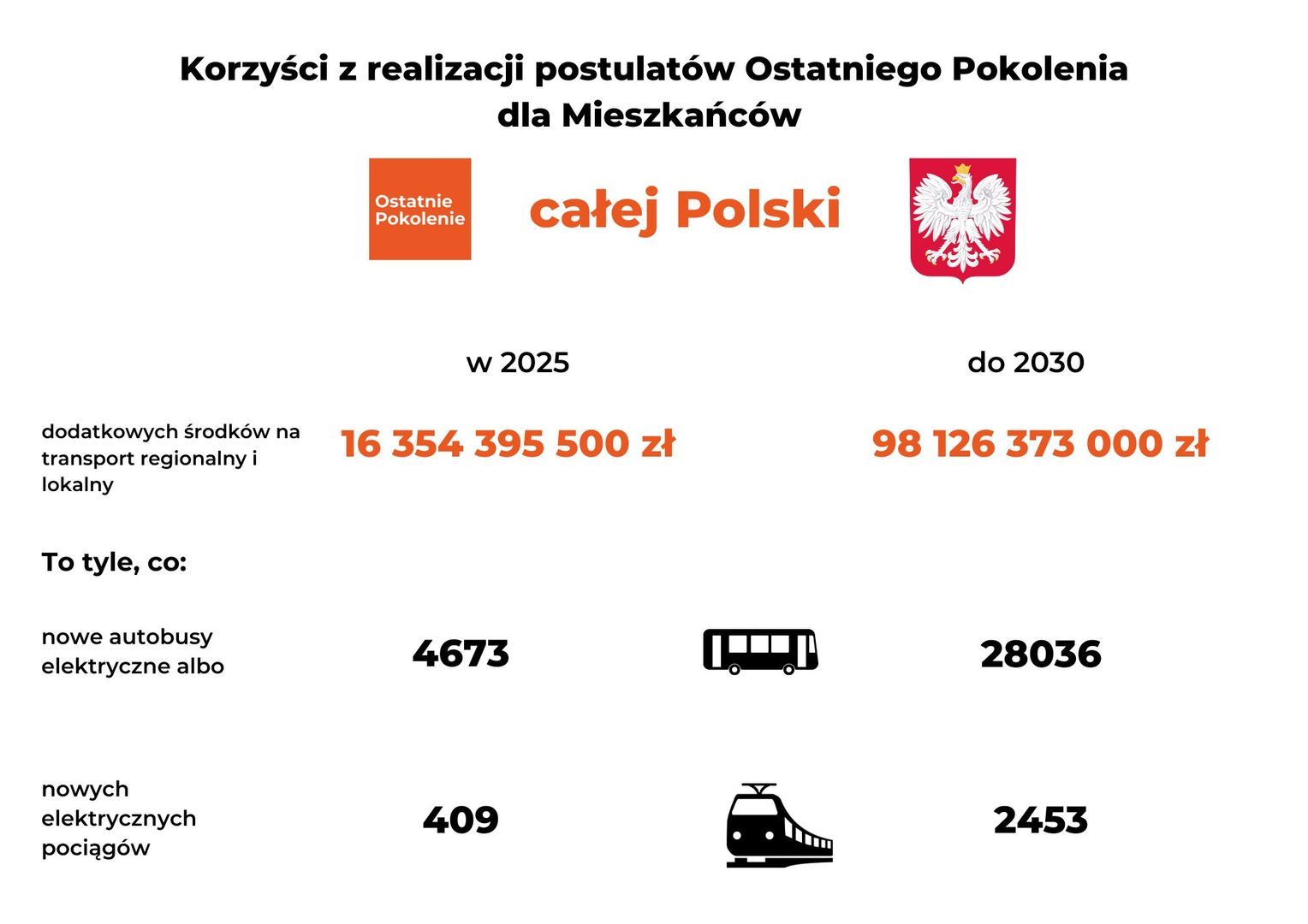 Popatrzmy na konkretne korzyści. Na przykład województwo podkarpackie. Mieszkańcy i samorządy mogliby dostać ok. 900 mln w tym roku, a ok. 5 mld 400 mln do 2030, 257 autobusów elektrycznych teraz, 1543 do 2030, albo 23 elektryczne pociągi regionalne teraz, a 135 do 30 - mówił na konferencji Andrzej Strzałkowski z Ostatniego Pokolenia, doktorant socjologii, magister prawa oraz jeden z autorów obliczeń.