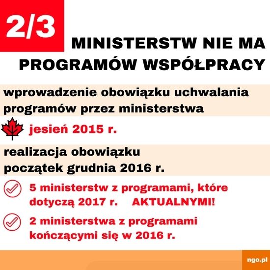 Kiedy na jesieni 2015 r. wchodziła w życie ustawa o zmianie ustawy o działalności pożytku, moment na tworzenie programów współpracy nie był sprzyjający. Koniec roku oraz zmianę rządu można było przyjąć za racjonalne usprawiedliwienie dla nieuchwalenia programów na czas - czyli do 30 listopada. Minęło jednak kilka miesięcy i nadal w tej sprawie nie działo się wiele. A potem zaczęło się dziać źle. Podsumujmy jak w 2016 r. przebiegała w ministerstwach realizacja zapisów artykułu 5b ustawy o pożytku.