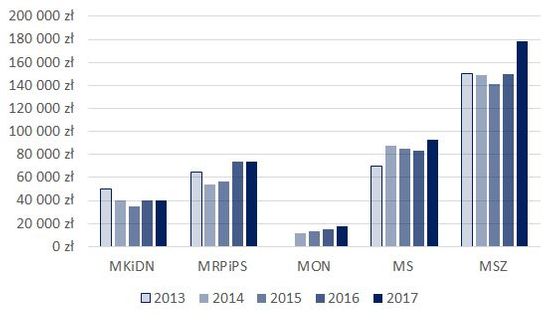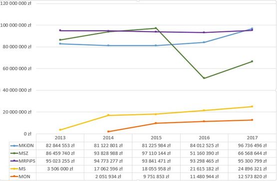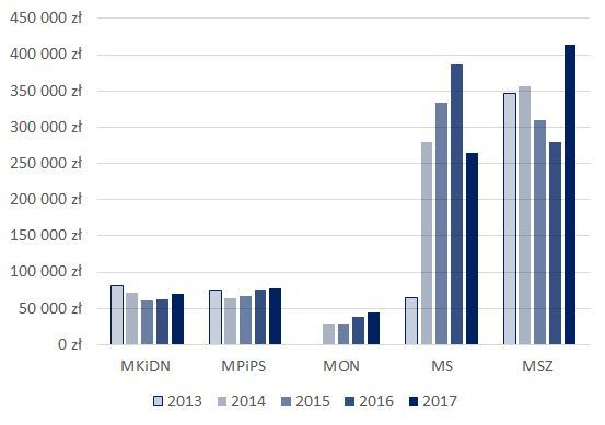 Trudno jednak ocenić zmianę, jaka dokonała się w wysokości przeznaczonych na otwarte konkursy środków między 2013 a 2017 rokiem. W przypadku czterech na pięć ministerstw kwoty przeznaczane na dotacje dla organizacje rosły, choć przyrost był zazwyczaj niewielki (kilku lub kilkunastoprocentowy). Wyjątek stanowi MON, w którym między 2014 a 2016 sumy przeznaczane na dotacje wzrosły ponad pięciokrotnie, jednak w liczbach bezwzględnych były one niewielkie.