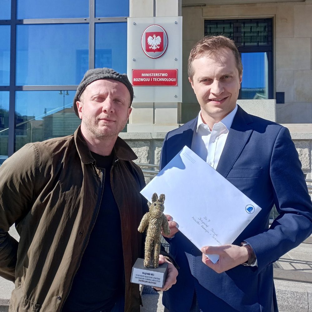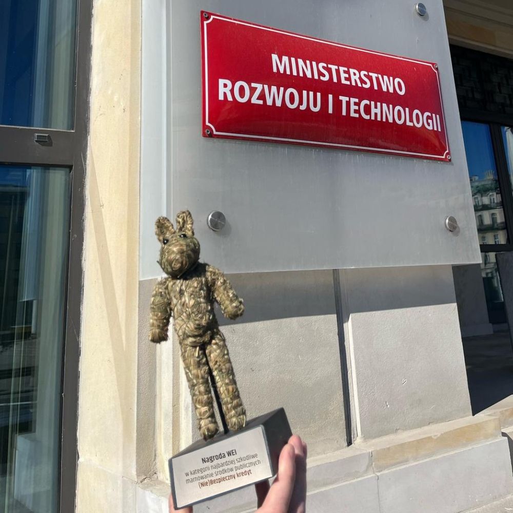 3 kwietnia 2025 roku pod siedzibą Ministerstwa Rozwoju i Technologii w Warszawie wręczyliśmy pierwszą antynagrodę za najbardziej szkodliwe marnowanie publicznych środków! Słomiany miś został wręczony Ministrowi Rozwoju i Technologii za grzechy swoich poprzedników…