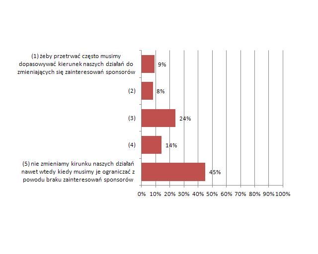– Przedstawiciele organizacji czasem czują się zmuszeni do poszukiwania środków finansowych pozwalających na przetrwanie ich organizacji i nie ukrywają tego. Chodzi tu o np. zdobycie środków na utrzymanie zatrudnienia lub utrzymanie lokalu – mówi Piotr Adamiak. – Z wykresu wynika, że jedna na dziesięć organizacji przyznaje się do tego, że działa ściśle według tego modelu. Moim zdaniem ten odsetek w rzeczywistości może być jednak wyższy – badani czują, że takie postępowanie może być uznane za niewłaściwe i mogą starać się ukryć ten fakt.
