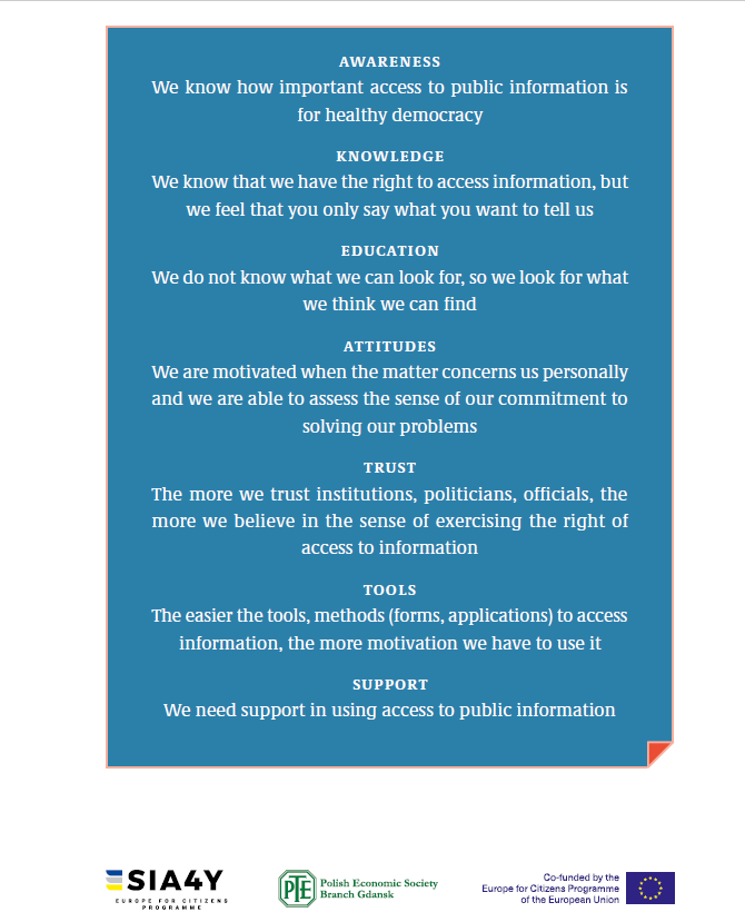 Przedstawiamy dokument będący rezultatem projektu „Wzmacnianie praw obywatelskich poprzez dostęp do informacji publicznej dla europejskiej młodzieży”, dofinansowanego ze środków programu Europa dla Obywateli, a realizowanego w 5 krajach europejskich pod przewodnictwem Polskiego Towarzystwa Ekonomicznego oddział w Gdańsku. Potrzeby w zakresie polityki transparentności zostały sformułowane na podstawie analizy opinii młodych Europejczyków biorących udział w spotkaniach projektu oraz ankiety przeprowadzonej od marca 2018 r. do Styczeń 2020r. Nasze rekomendacje dla polityki transparentności oparliśmy także na podstawie korespondencji i dyskusji z partnerami projektu: SOCIALAS INOVACIJAS CENTRS z Łotwy; WeCitizens z Belgii; Aktiivinen Eurooppalainen Kansalainen Suomi Ry z Finlandii; Stowarzyszenie Gmin RP Euroregion Bałtyk z Polsk oraz Eesti Naisuurimusja Teabekeskus z Estonii.