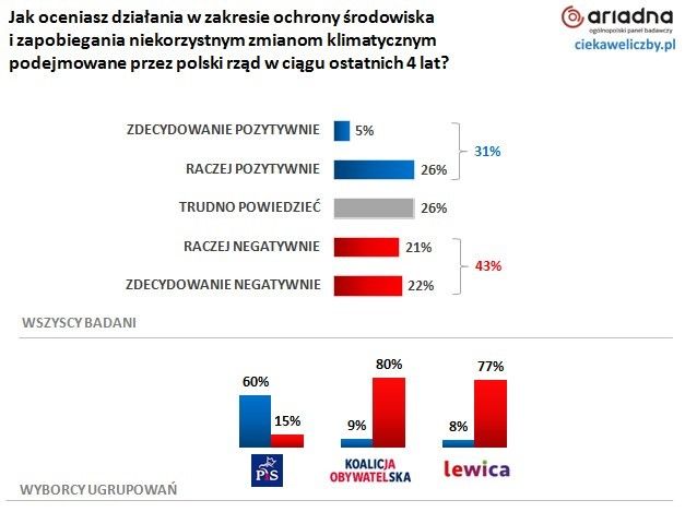 Opinie negatywne (43%) przeważają nad pozytywnymi (31%), jeśli chodzi o ocenę działań polskiego rządu, podejmowanych w zakresie ochrony środowiska i zapobiegania niekorzystnym zmianom klimatycznym w ciągu ostatnich 4 lat. 26% badanych nie jest w stanie się określić. Zdecydowana większość wyborców Koalicji Obywatelskiej (80%) i Lewicy (77%) działania rządu w tym zakresie ocenia negatywnie, podczas gdy wśród wyborców Prawa i Sprawiedliwości przeważają oceny pozytywne (60%).