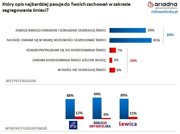 Większość dorosłych Polaków (84%) deklaruje, że segreguje śmieci: 39% robi to zawsze bardzo starannie i dokładnie, a 45% na ogół stara się je segregować w miarę możliwości. 7% badanych rzadko przykłada się do segregowania śmieci, 3% unika segregowania śmieci, jeśli nie musi, a 6% nie segreguje ich wcale. Najwięcej osób deklarujących, że zawsze lub na ogół segreguje śmieci jest w elektoracie Koalicji Obywatelskiej (94%). Wśród wyborców PiS i Lewicy odsetek osób segregujących śmieci jest na podobnym poziomie (88% vs. 89%).